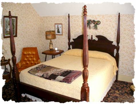 The Bird Room, as described by a visiting newspaper reporter, "feels as though it belonged to a lumber baron". From the vibrant, plush carpet to the birds-in-flight wallpaper, this bedroom is strictly Victorian. A stained glass parlor lamp stands on a federal era highboy, creating a comfortable reading corner. The queen size four-poster bed and spacious feeling of the Bird Room makes this a perfect choice for an overnight of contentment.